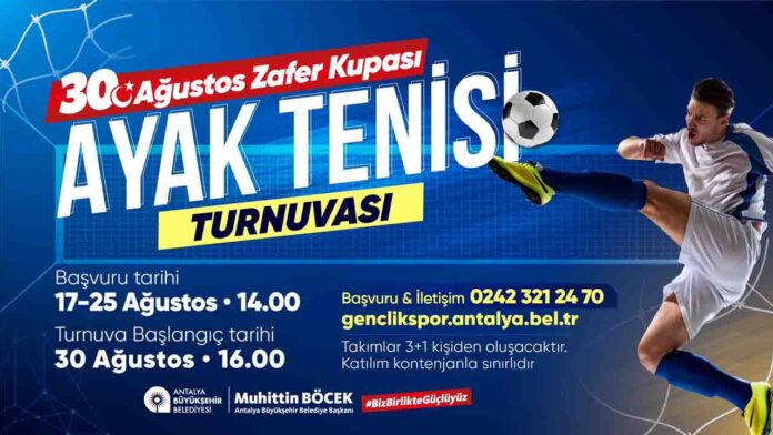 Antalya Büyükşehir Belediyesi Gençlik ve Spor Hizmetleri Dairesi Başkanlığı tarafından düzenlenecek “30 Ağustos Zafer Bayramı Ayak Tenisi Turnuvası’’ takımların birbirlerini yenerek bir sonraki aşamaya geçebileceği eleme usulü ile yapılacak. 30 Ağustos Salı günü 16.00’ da başlayacak olan ayak tenisi turnuvası, Konyaaltı Beach Parkt’a tenis kortlarının yanında bulunan çim alanda gerçekleştirilecek. Müsabakalara katılacak takımlar 3 asil ve 1 yedek oyuncu olmak üzere 4 kişiden oluşacak. Turnuvaya katılmak isteyenler www.abbsporhizmetleri.com internet sitesi üzerinden 25 Ağustos Cuma gününe kadar başvuru yapabilecek. Turnuvayla ilgili Antalya Büyükşehir Belediyesi Gençlik ve Spor Hizmetleri Dairesi Başkanlığı’nın  0242 321 24 70 numaralı telefonundan bilgi alınabilecek.