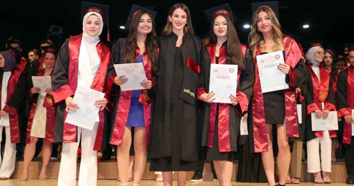 Saygı Duruşu ve İstiklâl Marşı’nın okunması ile başlayan törende mezun öğrenciler adına bir konuşma gerçekleştiren Eczacılık Fakültesi birincisi Yaren Tarun, “Bu kutsal mesleğe 5 yıl önce beyaz önlük giyme töreni ile adım attık. Fakültenin kapısından girişim daha dün gibi aklımda. Bizleri nelerin beklediğini bilmeden korku ve heyecanla karışık bir duygu vardı içimizde. Kıymetli hocalarım ve sevgili çalışanları ile bir yuva oldu bu fakülte bizlere. Zorlu ve keyifli zamanlar geçirdik. Zorlu sınavlar için sabahladık ve laboratuvarlara girip beyaz önlüklerimizi kirlettik. Bugün ise bu zorlu yolculuğu tamamlayıp siz kıymetli ailelerimizin huzurunda mezun olmanın haklı gururu ve mutluluğunu yaşıyoruz. Sözlerimi başarılarımda emeği geçen değerli insanlara teşekkür ederek bitirmek istiyorum.” dedi.
