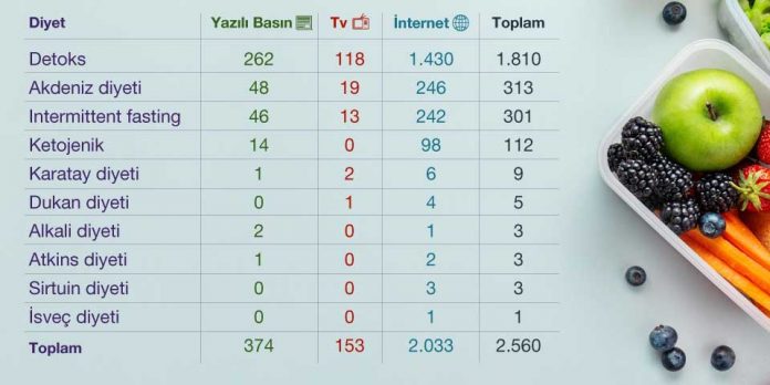 Medya Takip Merkezi’nin incelediği son bir aylık veri sonuçlarına bakıldığında belirtilen diyetlerin internette, 2 bin 33 habere konu olduğu görüldü. Yazılı basın mecrası ise internetten sonra 347 haber ile en çok haber yapan 2. geleneksel medya mecrası olurken, konuya dair 118 haber yapan televizyon kanallarının diyetlere çok fazla yer vermedikleri dikkatlerden kaçmadı.