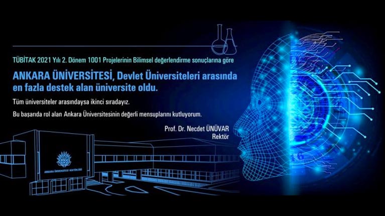 Ankara Üniversitesi TUBİTAK Bilimsel ve Teknolojik Araştırma Projelerini Destekleme Programı (1001) kapsamında 2021yılı 2.döneminde Araştırma Destek Programları Başkanlığı’na (ARDEB) önerilen projelerin bilimsel değerlendirme sürecinin tamamlanmasıyla bu dönemde kabul edilen 12 proje ile sıralamada devlet üniversiteleri arasında en çok projesi destek gören üniversite olurken, tüm üniversiteler arasında ise 2.sırada yer aldı.