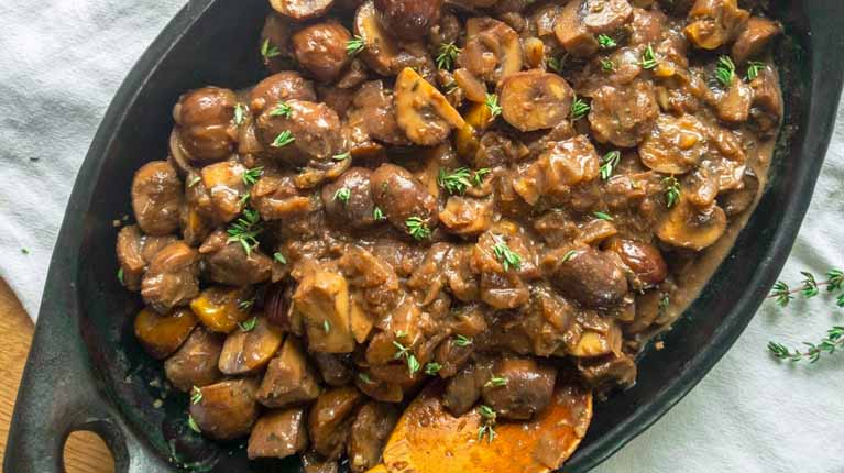 Malzemeler: 4 yemek kaşığı zeytinyağı, 1 adet kuru soğan, 400 gram kestane mantarı, 3 diş sarımsak, taze kekik, tuz, karabiber, soya sosu ve kestane.